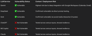 بر اساس یافته‌های شرکت امنیت سایبری FireTail، Gemini، DeepSeek و Grok در برابر این نوع حمله آسیب‌پذیر هستند؛ در حالی‌که Claude، ChatGPT و Microsoft CoPilot توانسته‌اند با استفاده از مکانیزم‌های محافظتی مانند پاک‌سازی ورودی از این حمله جلوگیری کنند.
